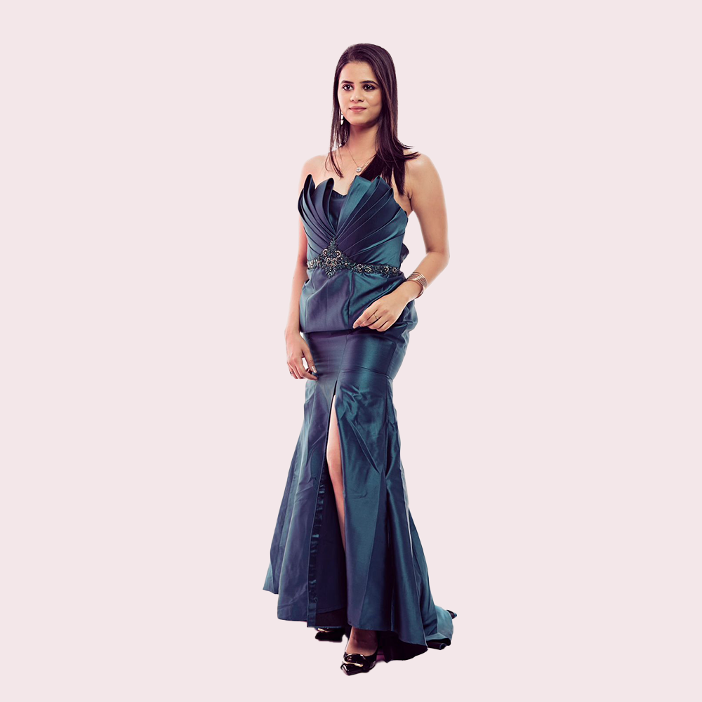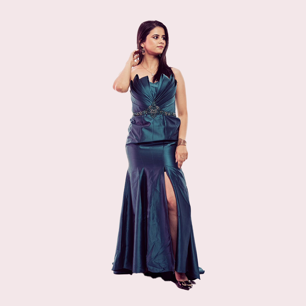 This luxurious tube peacock teal silk gown elevated with exquisite hand embroidery. This gown drapes gracefully around your curves and its mermaid silhouette add elegance to your personality. the bandeau neckline accentuates your shoulder while the high slit adds a touch of drama. Adorned with meticulous hand embroidery this gown is a masterpiece of craftmanship. Perfect for glamorous occasions where you desire to leave a lasting impression.