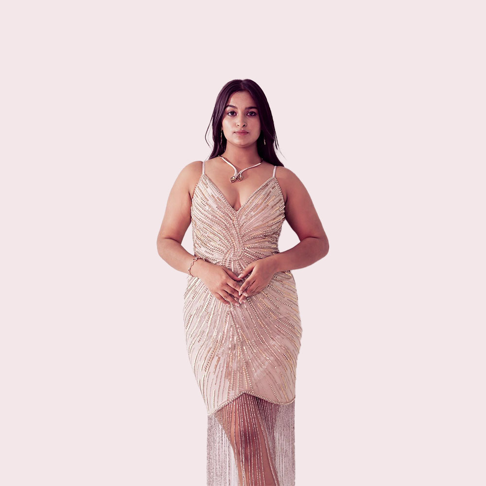 Beige sleeveless dress adorned with intricate embellishments. The dress features a timeless silhouette, accentuated by delicate long tassels at the hem, adding a touch of movement and allure to your every step. Perfect for those special occasion where sophistication meets effortless charm.
