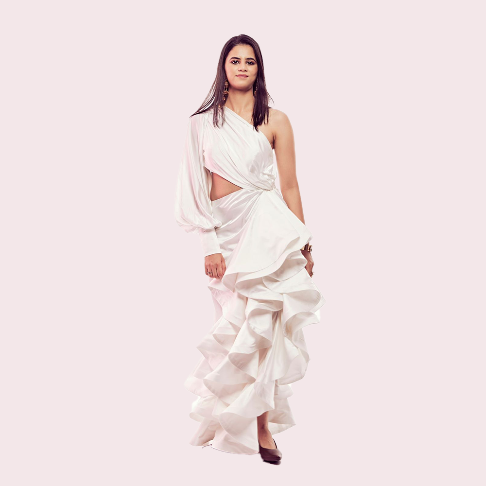 This exquisite dress is a vision of modern elegance. its snowy white hue radiates purity and sophistication while one shoulder adds touch of allure. The cut-out waist accentuates your figure creating striking silhouette. Crafted from luxurious silk this dress drapes gracefully with ruffled detailing. whether you are attending a romantic dinner or dance your heart out this dress ensure glamour all along.